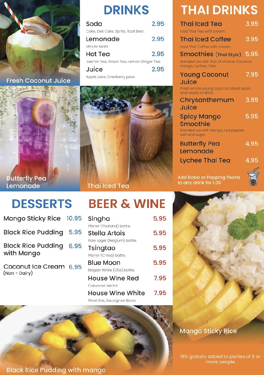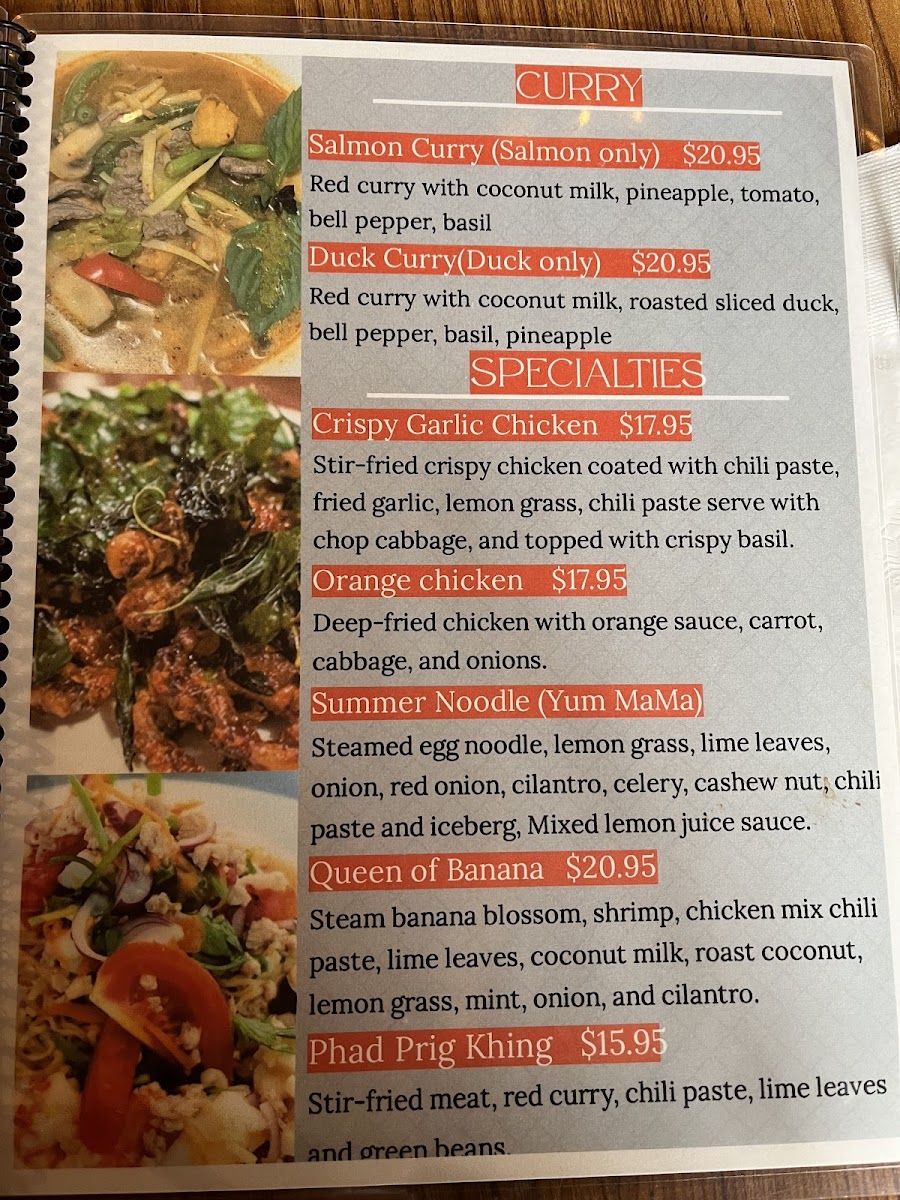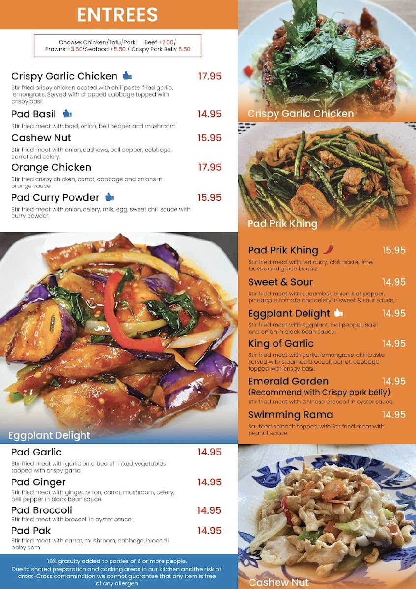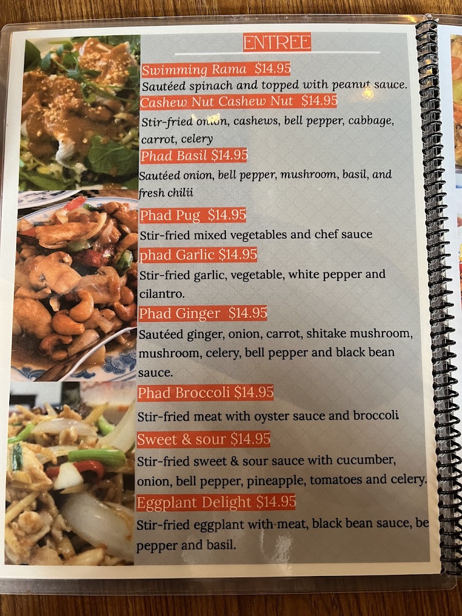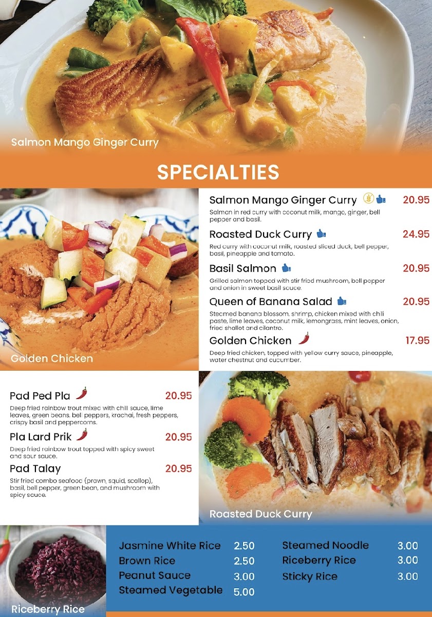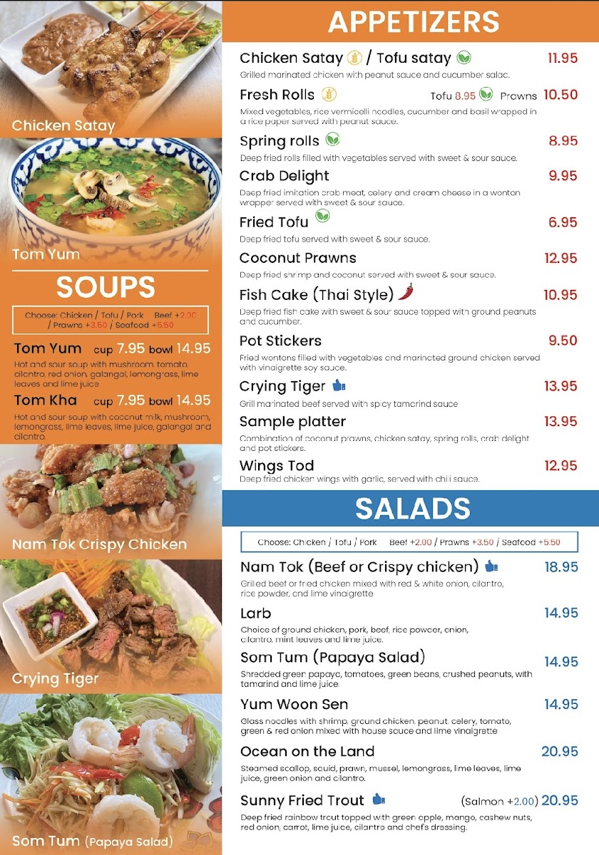 The appetizing menu extends to delicious starters, with crowd-pleasers like Pot Stickers and the Crab Delight, which bursts with flavor as you dip into the accompanying sweet and sour sauce. Each bite is a melody of textures and tastes, inviting you to savor the cheerful complexity of Thai cuisine.